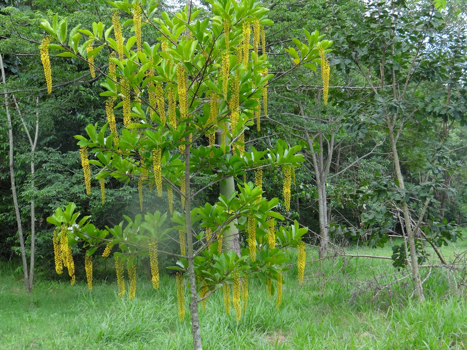 Características morfológicas - Altura de 10-20 m, com tronco de 30-40 cm de diâmetro. Folhas simples, membranáceas, lactescentes quando jovens, glabras, de 16-22 cm de comprimento por 8-11 cm de largura. Inflorescência em racemos terminais pendentes.