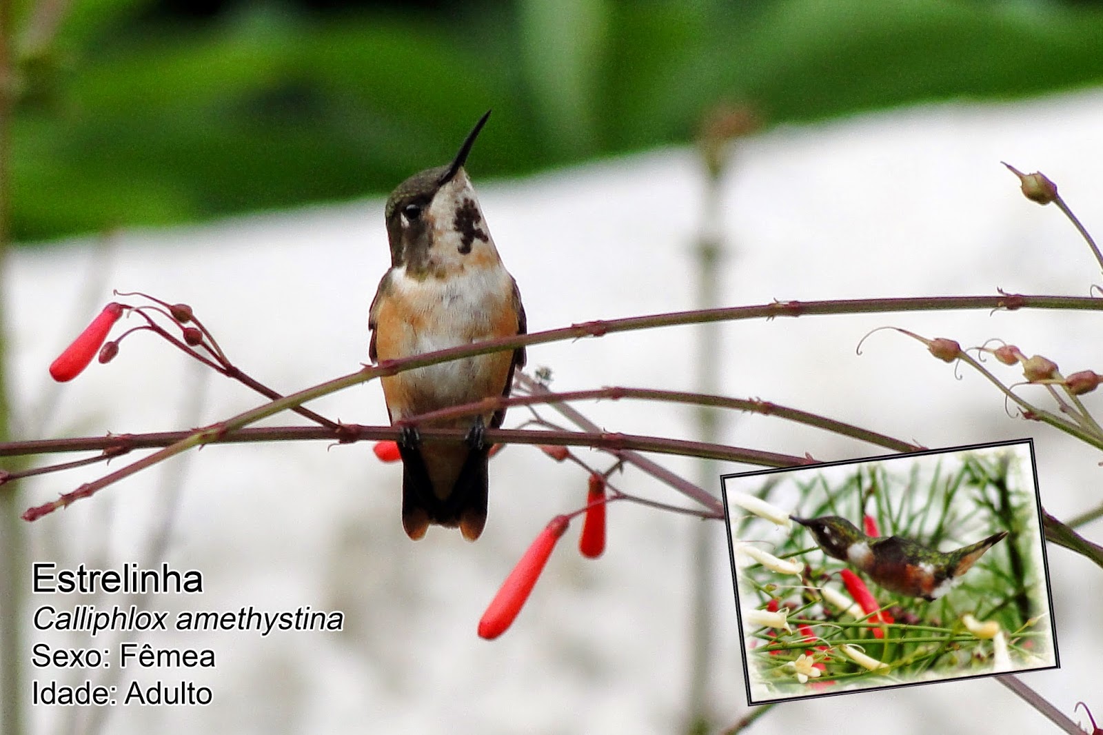 Foto de minha autoria, feita na Fazenda Mirante da Serra, dos amigos Claudia e Rodolfo. A fêmea descansa no ramo da Corda-de-Viola --ipomea hederifolia L., após sugar seu néctar