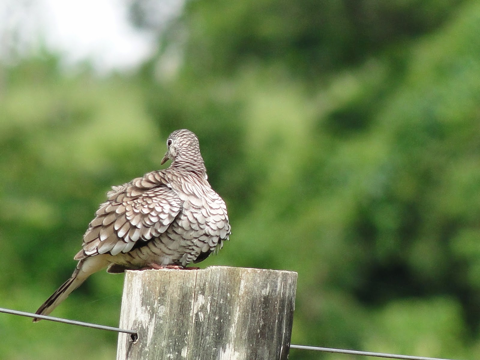 Razoavelmente comum, de ampla ocorrência em áreas abertas, como pastos e plantações, e perto de casas; prefere lugar com terra nua. As vezes incluída no gênero Columbina. Cauda longa. Pardo-cinzenta por cima e branco por baixo, toda escamada com preto. Na asa, penas de voo com extenso ferrugíneo (visível em voo); penas externas da cauda pretas com orla branca. Única rolinha escamada. Em casal ou bandinhos, anda pelo chão de cauda erguida; às vezes com a rolinha-picuí.