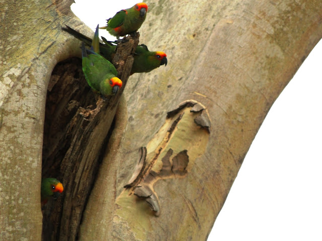 Psitacídeos - Aves coloridas, de bico curto muito curvo e pés hábeis. Porte variável, cauda curta ou longa. Ruidosas e sociáveis, a maioria aninha em ocos de árvores. Silenciam quando pousam e podem ser detectadas pela  "chuva" de restos que cai ao comerem frutos e sementes.